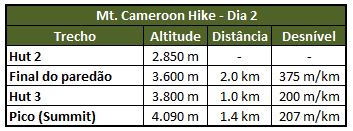 17:00 Final do dia 2 com nossa chegada ao Hut 2, onde Joseph já nos esperava com a janta quase pronta. Nessa noite comemos arroz branco com um creme de amendoim bem típico de Camarões que estava maravilhoso! Sério, tive que pedir a receita para replicar depois, rs. Depois da janta tomei mais um banho de gato (leia-se: lencinhos umedecidos), troquei algumas camadas de roupa, agradeci mais uma vez por poder viver isso e encarei mais uma noite desconfortável e com pesadelos.